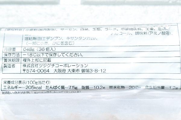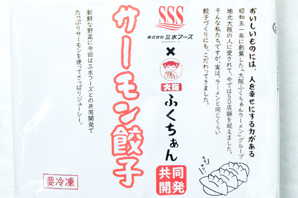 賞味期限11月16‐17日位の特価品。北海道産サーモンを使用した商品です。大阪の人気店である「ふくちぁん餃子」と三水フーズが共同開発したおすすめ品。もちもちした食感とジューシーな魚の味わいがたまりません。焼き餃子、蒸し餃子、鍋の具材などに最適な1品。